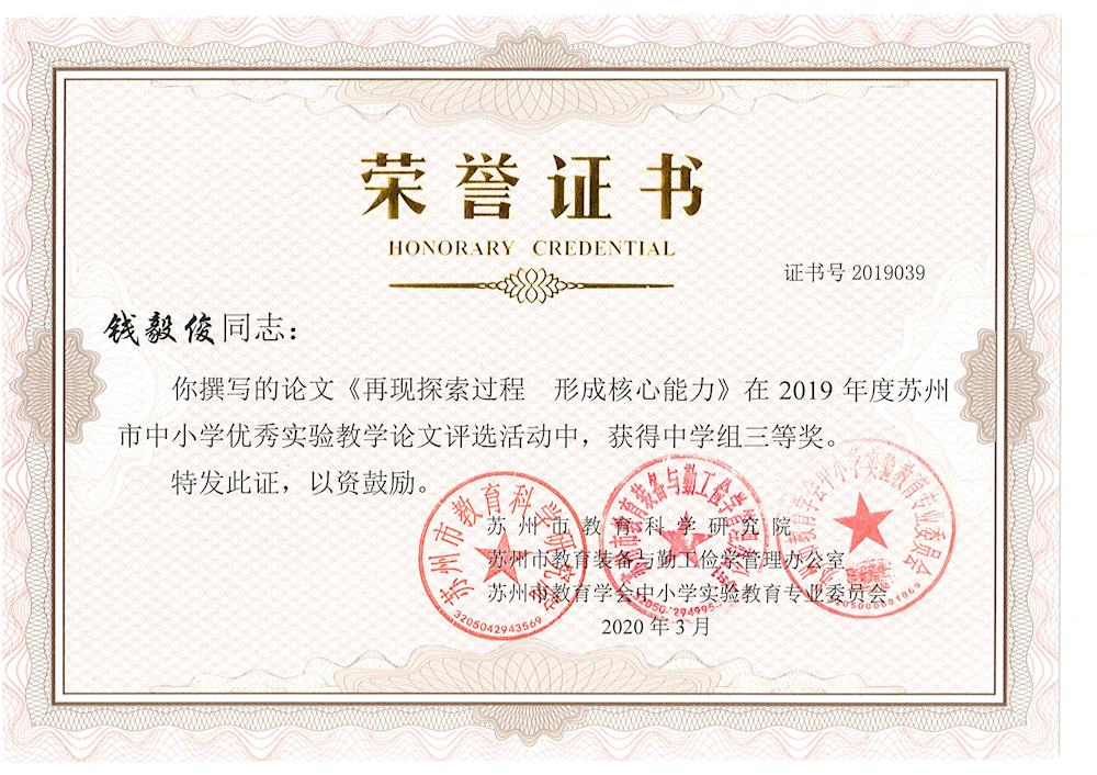 2019年苏州市中小学优秀实验论文获奖情况公布 来源: 发布时间:2020-04-23 07:33:08 浏览次数: 次 【字体:小 大】 我校钱毅俊老师在2019年苏州市中小学优秀实验论文评比中获苏州市三等奖 分享到: 【打印正文】